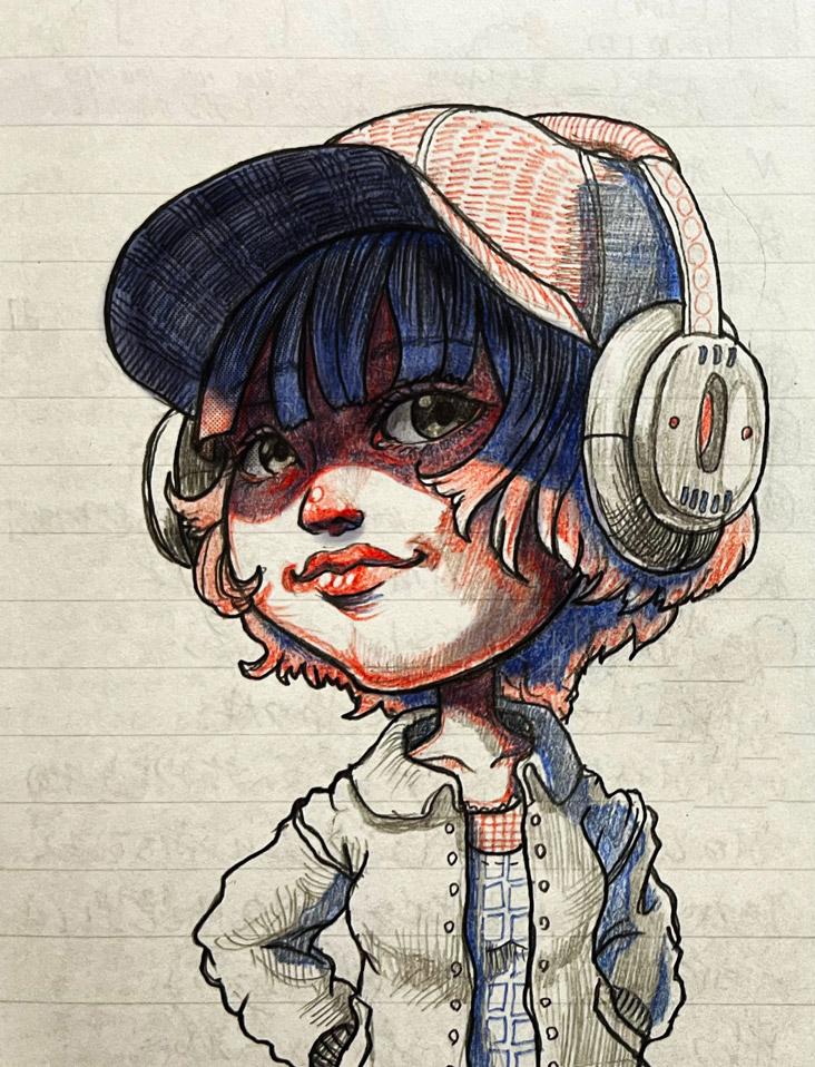 色鉛筆で描いたキノコの擬人化のらくがきです。